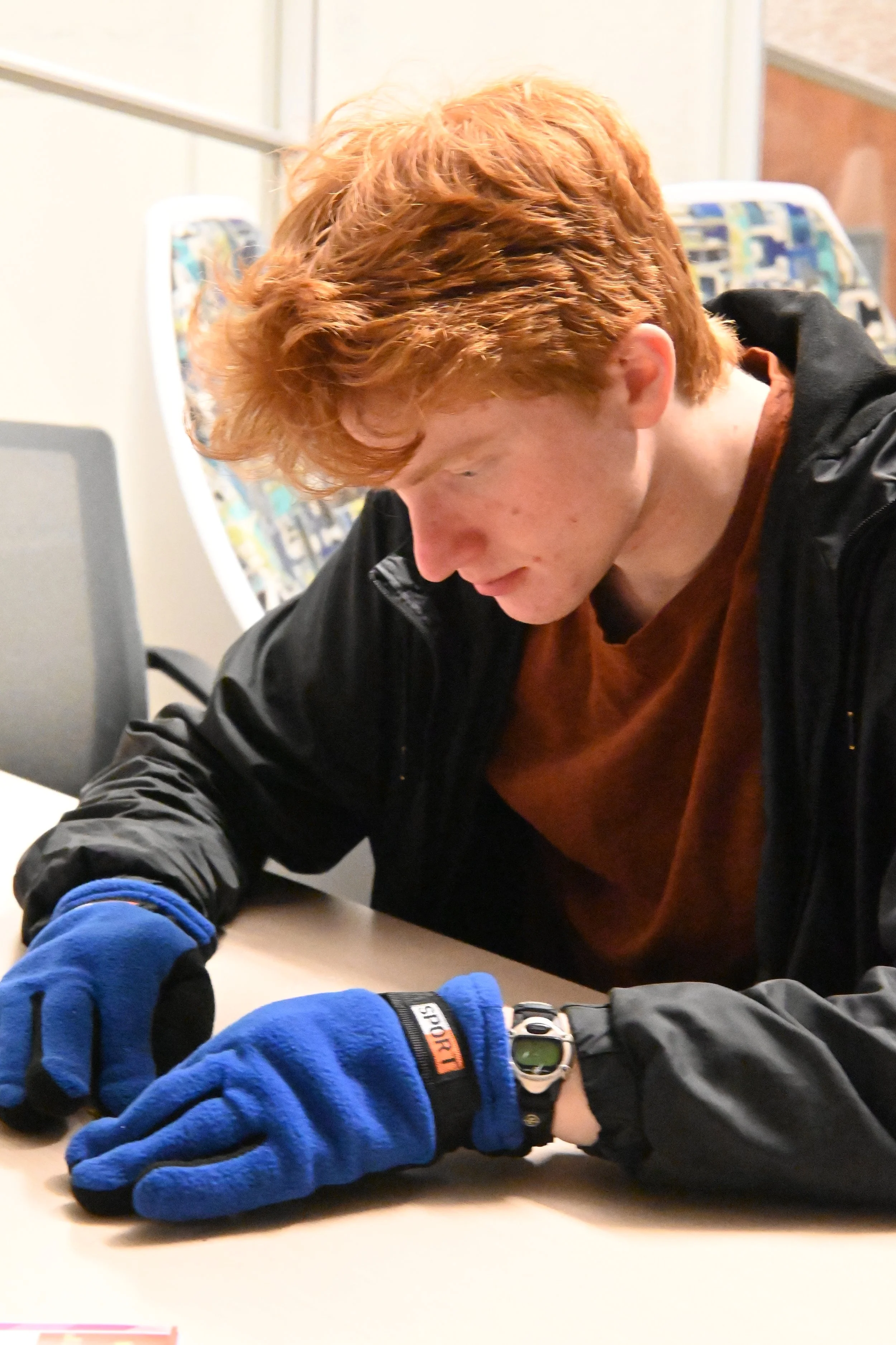 Ty Hatler is shown completing the origami activity while wearing gloves.